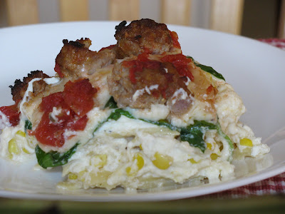 Layer in casserole dish as follows.Pasta, corn mix, cheese mix then another layer of pasta.Repeat this process until the cheese and corn are all in the dish.Then layer spinach and mozzarella cheese topping with the sausage tomato mix.